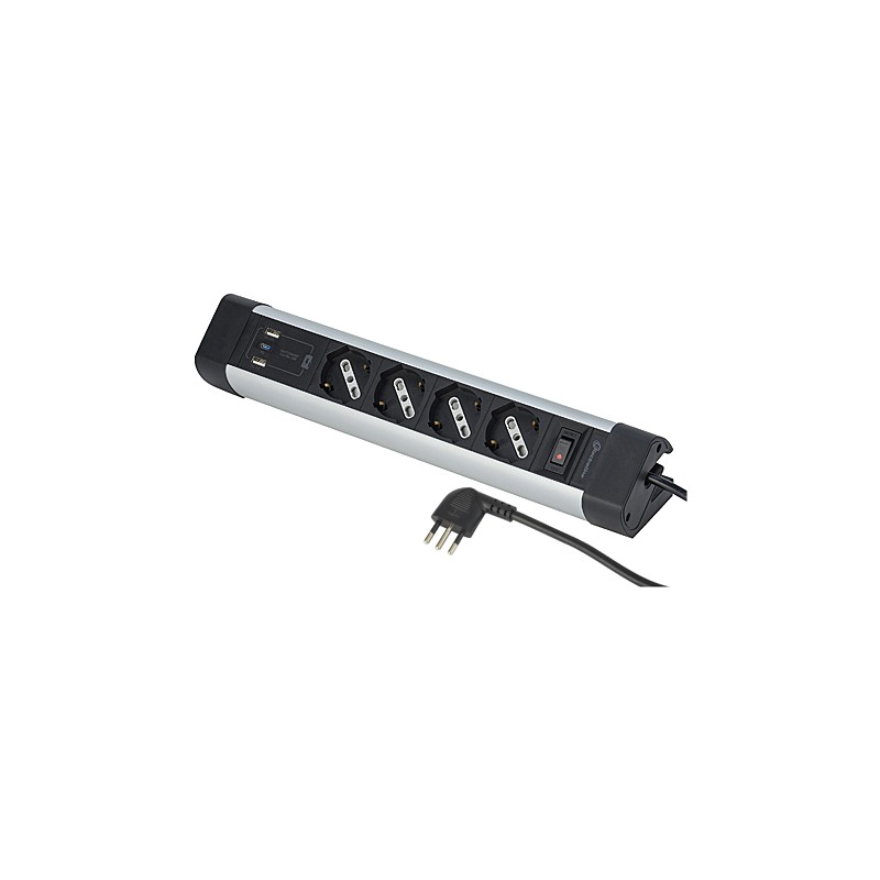 Multipresa con corpo in alluminio. 4 prese 10/16A, schuko. Con 2 porte usb e 1 type-c. Interruttore On/Off. Cavo da 2 mt H05VV-F. Sezione cavo 3x1 mm2. Inclusi 2 supporti per fissaggio a scrivania.