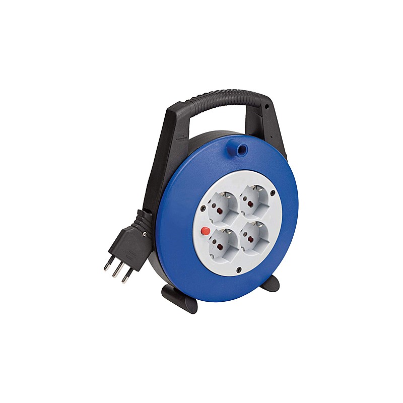 Avvolgicavo con alloggiamento in plastica antiurto. Maniglia ergonomica. Buona stabilita' grazie ai doppi piedini. Con protezione antisurriscaldamento. Spina 16A. 4 prese polivalenti 2P+T (schuko + 10-16A). Cavo H05VV-F 3G1,5. Modello = lunghezza cavo mt