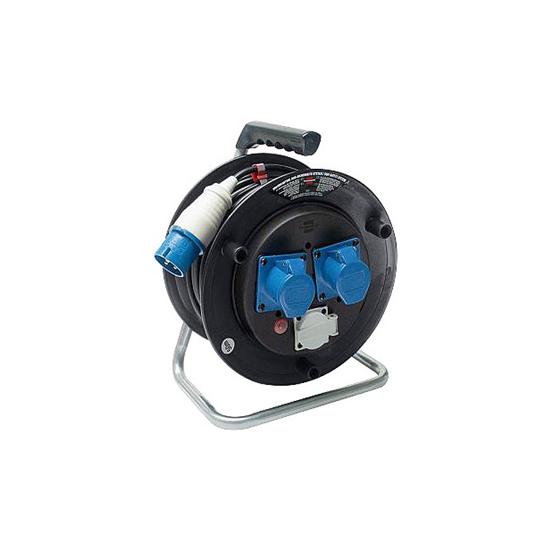 Avvolgicavo con corpo in plastica speciale e impugnatura ergonomica. 2 prese CEE 230V/16A. Spina CEE 230V/16A. IP44. Cavo da 25 mt H07RN-F 3G2,5. Diametro del tamburo 290 mm.