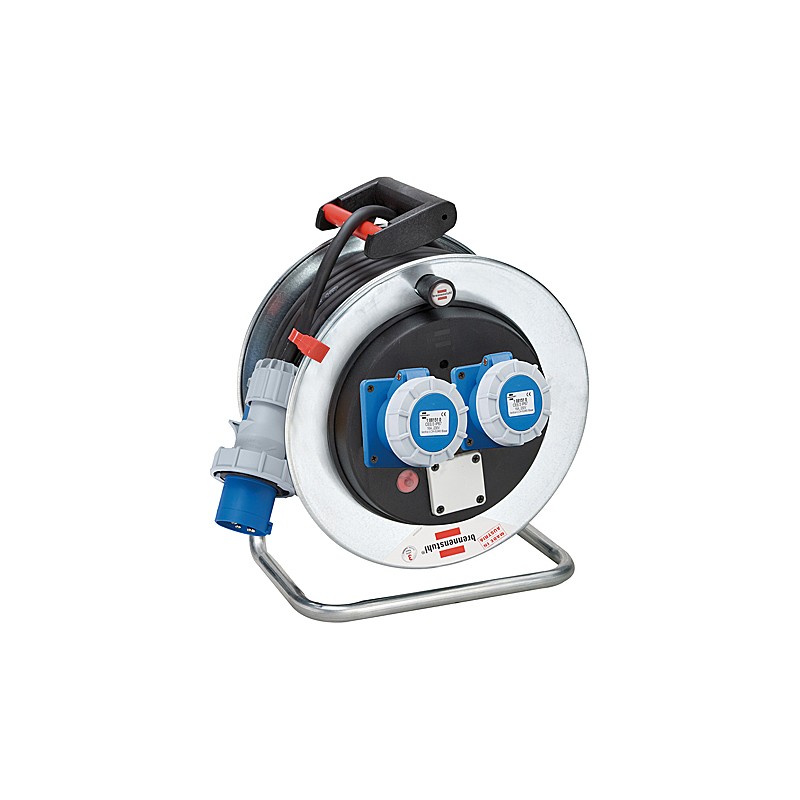 Avvolgicavo con corpo in lamiera d'acciaio zincata. Maniglia ergonomica con contenimento del cavo per una perfetta guida in fase di avvolgimento/svolgimento. Protezione anti-surriscaldamento. 2 prese CEE 230V/16A. Spina CEE a 3 poli 230V/16A. IP67. Cavo da 33 mt H07RN-F 3G2,5. Diametro del tamburo 290 mm.