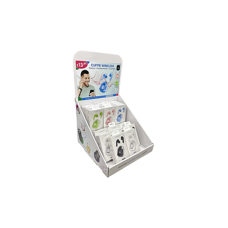 Espositore composto da 14 cuffiette DE323 (riproduzione musicale 4-5 ore, ricarica Usb-C, tempo di conversazione 5 ore, accoppiamento automatico). Colori: 2 verdi, 2 rosa, 2 azzurre, 4 bianche e 4 nere.