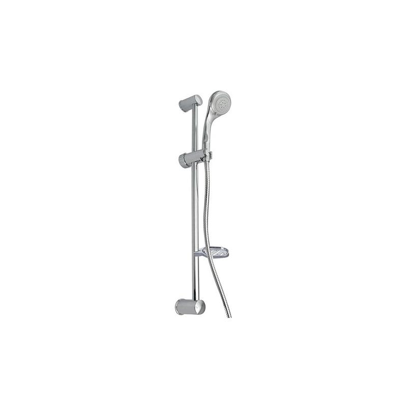 Saliscendi regolabile con portasapone cromato. Lunghezza 60 cm. Doccia con flessibile in acciaio inox.