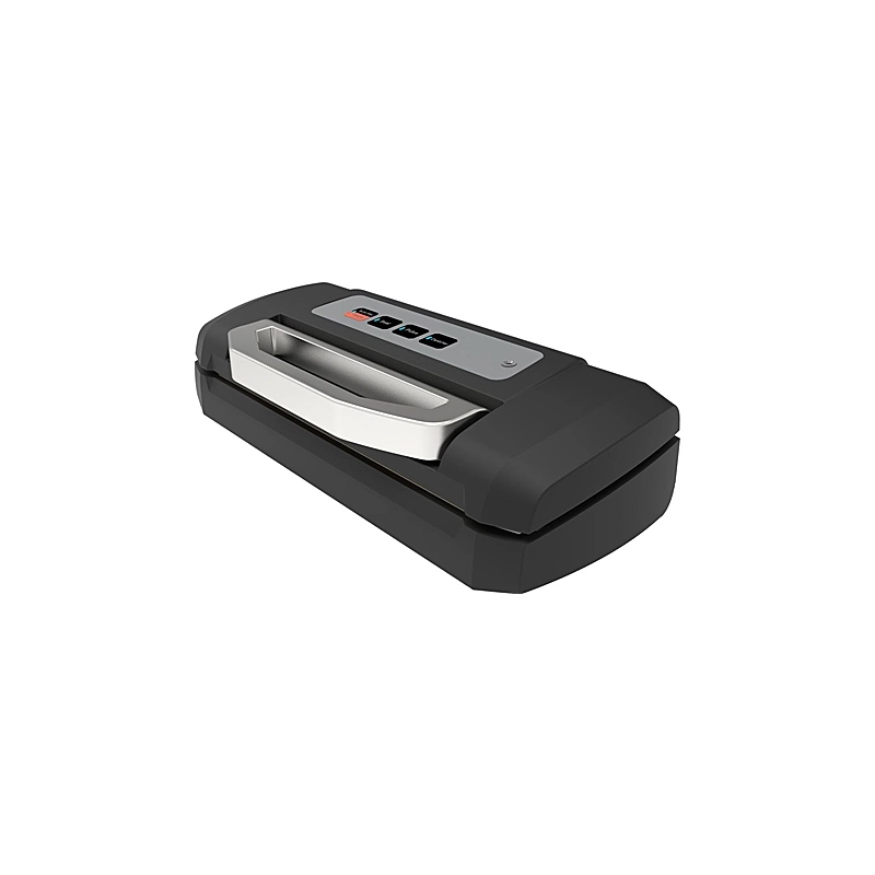 Macchina con corpo in pvc. Pompa a pistone autolubrificante a doppio corpo. Capacita' di aspirazione 9 lt/min. 110 Watt. Barra scaldante da 31 cm. Funzione saldatura manuale. Funzione vuoto ad impulsi per regolare il livello di vuoto manualmente senza danneggiare il contenuto del sacchetto. Funzionamento completamente automatico con possibiita' di utilizzo manuale. Dimensioni 40x18x11 cm.