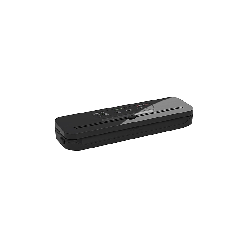 Macchina per sottovuoto in ABS ultracompatta. Pratico oblo' per il corretto posizionamento del sacchetto, taglia-sacchetti bidirezionale integrato. Attacco per tubo contenitori. Cavo rimovibile. Saldatura automatica. Display di avanzamento a 5 led. 1100 Watt. Protezione termica autoripristinante. Colore nero. Dimensioni cm 38x10x6. Peso Kg 0,94