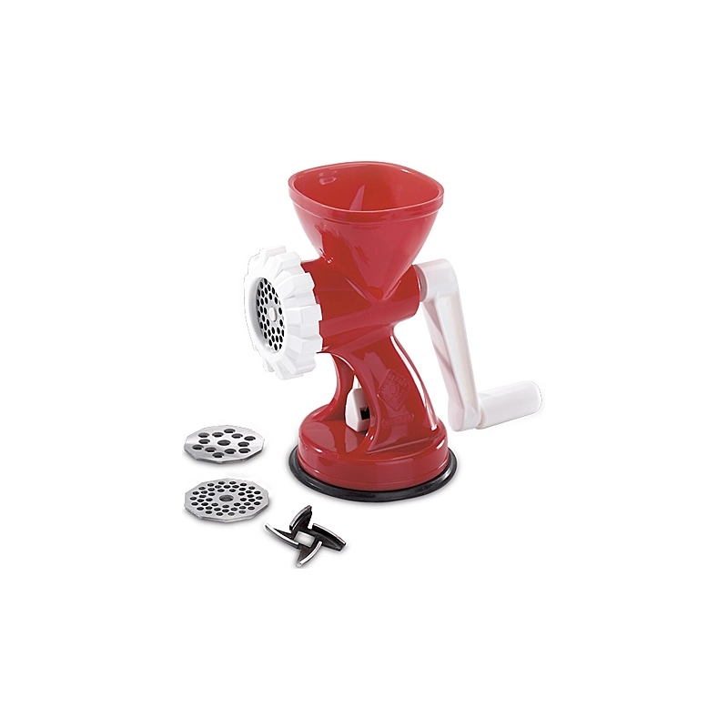Corpo e maniglia in polipropilene per alimenti. Completo di 2 dischi e 1 coltello in acciaio inox per tritare e 3 dischi in nylon per la pasta.
