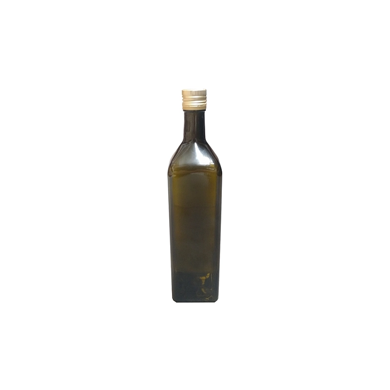 Bottiglia per olio a base quadrata completa di tappo metallico con interno versatore in plastica. Modello = contenuto lt