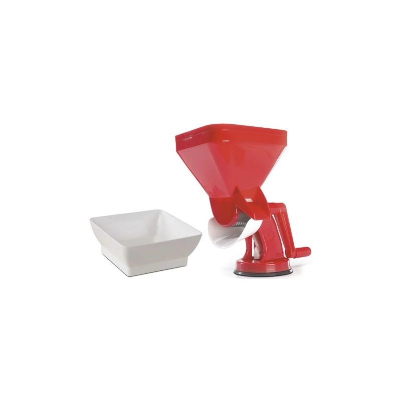 Passapomodoro con corpo in polipropilene, rullo e manovella in poliammide, retina in acciaio inox 18/C. Ventosa in gomma. Facilmente smontabile e lavabile in lavastoviglie. Con bacinella 20x20x8,5 cm. Made in Italy.