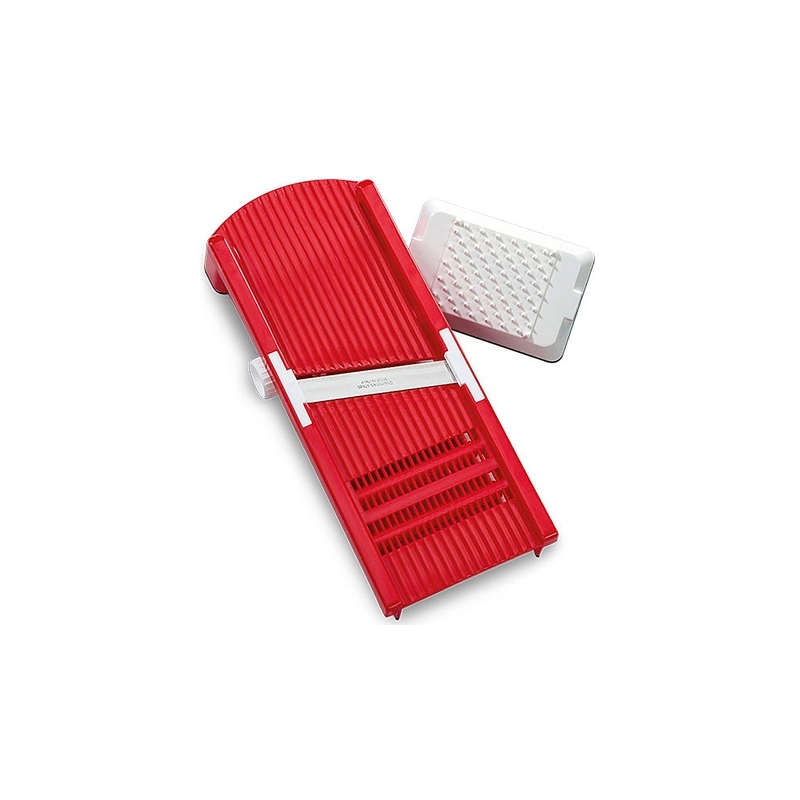 In polipropilene atossico per alimenti. Lama in acciaio inox temperato. Spessore di taglio variabile in 5 misure. Dotata di proteggi-dita. Dimensioni cm.4x13x29 h. Colori assortiti.