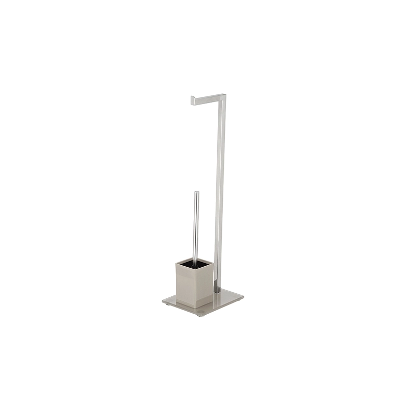Piantana con portarotolo e portascopino. In acciaio cromato con base in vetro temperato 8 mm colore grigio. Dimensioni 22x18x70,5h cm.