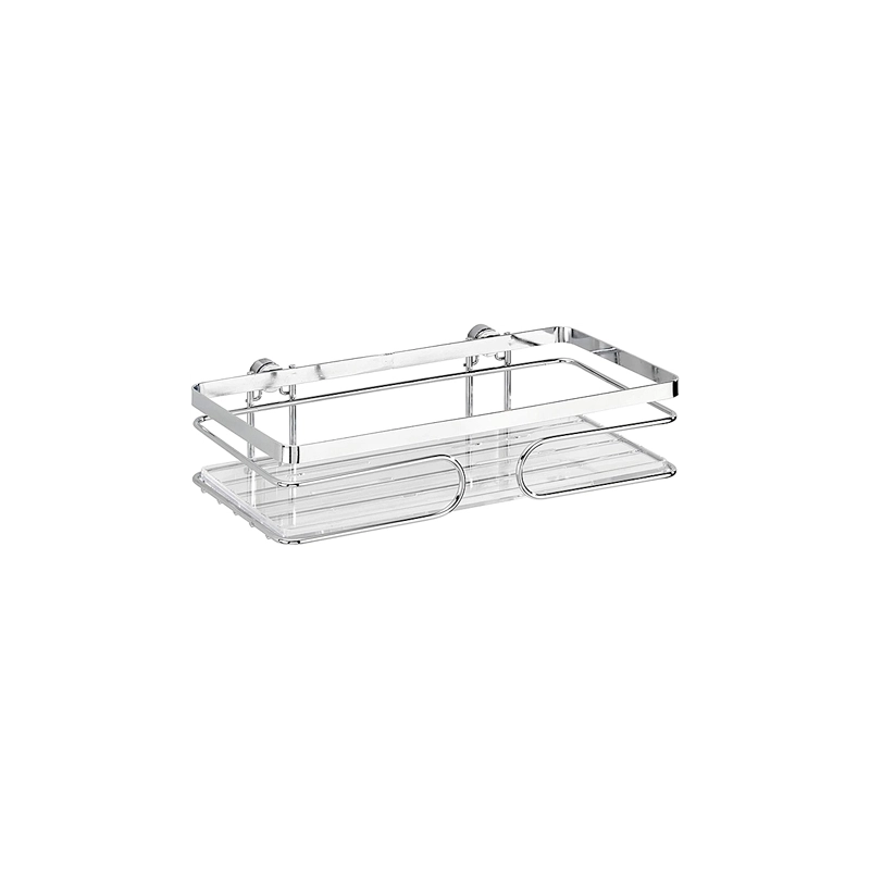 Mensola singola in acciaio inox. Vassoio interno in plastica trasparente. Viti e tasselli inclusi. Sistema di fissaggio POWER LOC adattatore per il fissaggio senza viti da acquistare a parte. Dimensioni 24x6,5x13,5 cm.