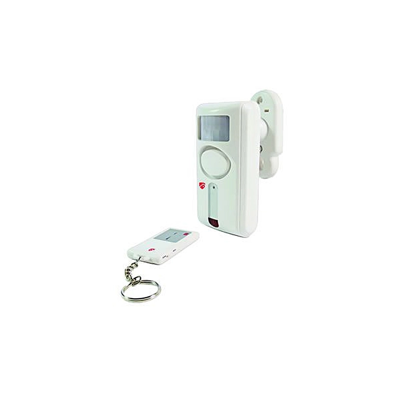 Allarme stand-alone con sensore di movimento ad infrarossi. Attivazione/disattivazione tramite telecomando. Completo di supporto a muro e kit fissaggio. Adatto solo per ambienti interni. Indicatore di batterie in esaurimento. Allarme con 3 batterie alcaline 1,5V AA (non incluse), telecomando 1 batteria 3V CR2032 (inclusa). Indicatore di batterie in esaurimento. Dimensioni 6,4x3,4x11,5 cm