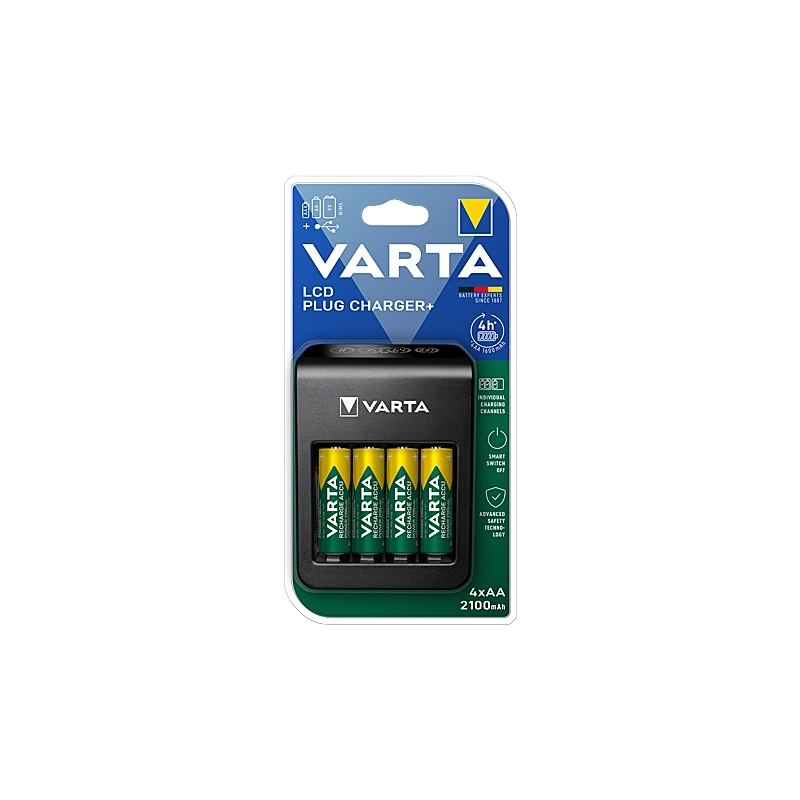 LCD Plug Charger + 4 batterie tipo AA x 2100 mAh - 1.2 V. Display LCD blu. Funzione controllo alimentazione. Carica fino a 4 batterie 2/4 AA o 2/4 AAA batterie. Voltaggio 220-240V. Individuazione di pile guaste. Controllo della temperatura. Timer di Sicurezza - Protezione da sovraccarica. USB. Tempo di carica 4 ore. 3 anni di garanzia.
