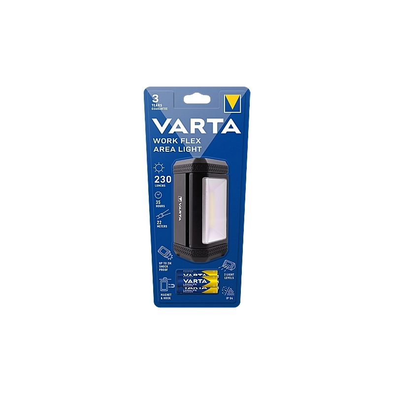 Torcia resistente agli urti (test di caduta da 2 mt), protezione IP54. 2 modalita': alta e bassa. Tecnologia COB LED. Magnete integrato nella parte inferiore della torcia. Molteplici opzioni di fissaggio: appeso con gancio, in appoggio oppure con magnete per lavorare a mani libere. Fascio luminoso fino a 22 mt. 230 Lumen. Fino a 35 ore di durata. Funziona con 3 batterie AA incluse.