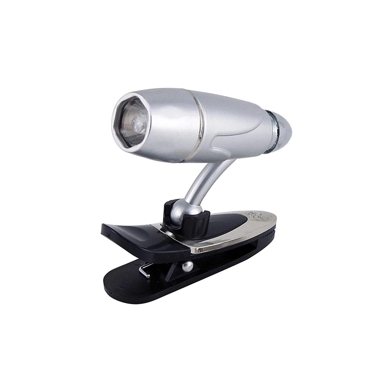 Torcia con clip ad inclinazione regolabile. Indicato per la lettura dei libri. Funziona con 3 batterie LR44 incluse.