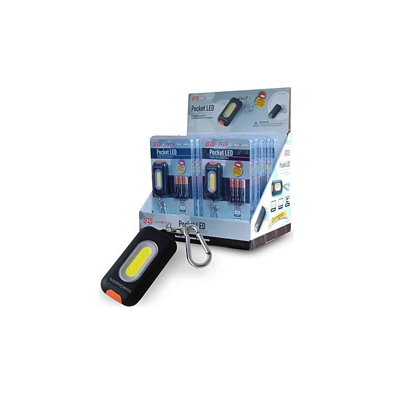 Torcia in abs antiurto a 1 Led COB da 0,5 Watt. 50 lumen. Autonomia 24 ore. Con moschettone portachiavi. Funziona con 3 batterie AAA Duracell (incluse).