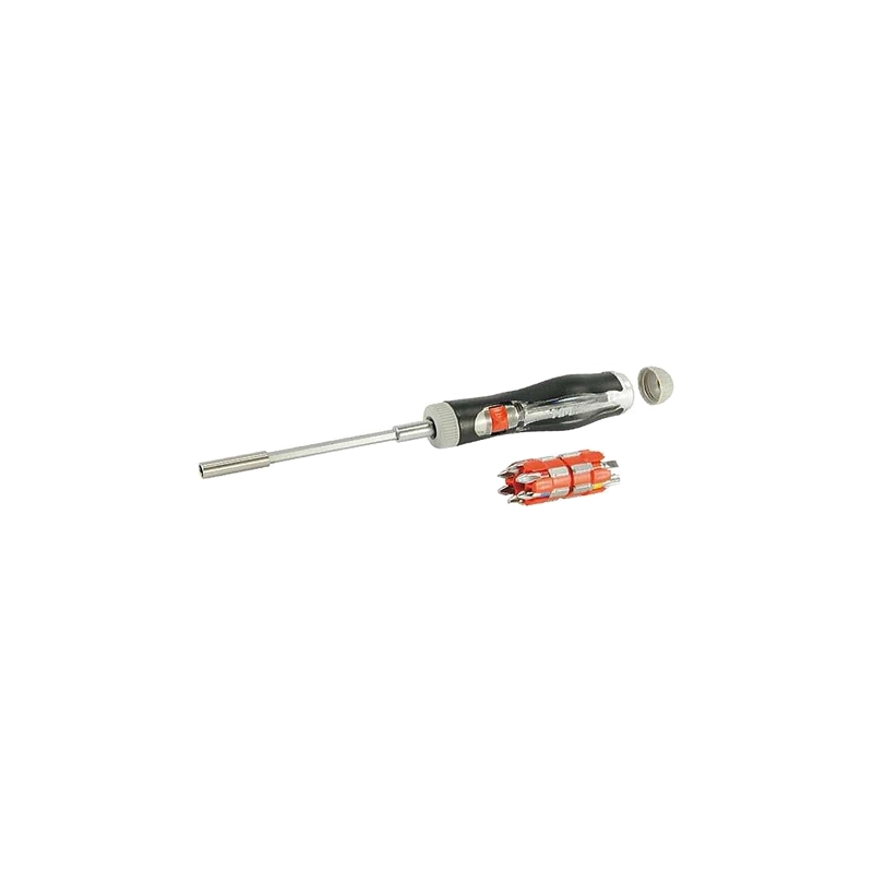 Cacciavite a cricchetto con impugnatura ergonomica in plastica infrangibile, attacco telescopico magnetico femmina da 1/4', dotazione 12 bits con inserti nell'impugnatura. Misure assortimento:1xPZ1/2xPZ2/1xPH1/2xPH2/1xFL4.0/1xFL6.0/1xTX15/1xTX20/1xTX25/1xTX30