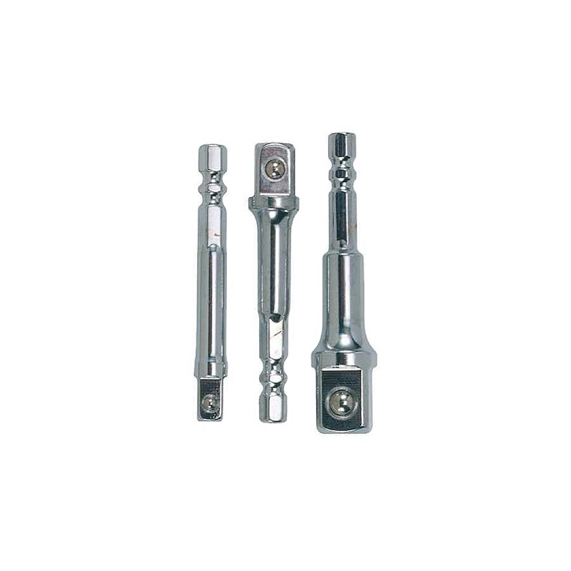 Kit 3 pezzi adattatore portabussole, in acciaio al cromo vanadio, cromato. Da 1/4' esagonale a 1/4' quadro, da 1/4' esagonale a 3/8' quadro e da 1/4' esagonale a 1/2' quadro.