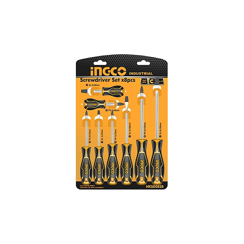 Set di 8 cacciaviti al cromo vanadio: 1 cacciavite SL 3,0x3x75 mm, 1 cacciavite SL 5,5x5x100 mm, 1 cacciavite SL 6,5x6x150 mm, 1 cacciavite SL 6,5x6x38 mm, 1 cacciavite PH0x3x75 mm, 1 cacciavite PH1x5x75 mm, 1 cacciavite PH2x6x125 mm, 1 cacciavite PH2x6x38 mm.