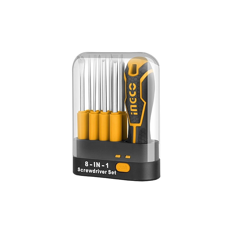 Set da 9 pezzi al cromo vanadio intercambiabili. Composto da: 1 cacciavite SL3x65 mm, 1 cacciavite SL5x65 mm, 1 cacciavite SL6x65 mm, 1 cacciavite PH0x65 mm, 1 cacciavite PH1x65 mm, 1 cacciavite PH2x65 mm, 1 rimuovi punta 5x65 mm, 1 punteruolo 3x65 mm e 1 impugnatura.