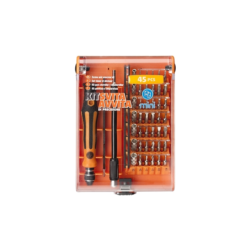 Kit composto da 45 pezzi: 1 impugnatura cacciavite, 1 prolunga, 35 inserti assortiti e 7 bussole.