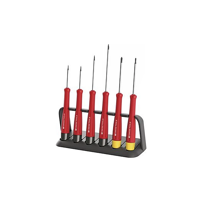 Assortimento di giraviti per elettronica, con pratico supporto da tavolo e parete combinato, 4 pezzi taglio (1.2, 1.5, 1.8, 2.5) e 2 pezzi PH (00, 0)