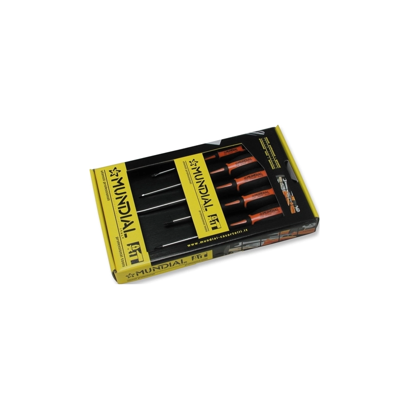 Serie di 5 cacciaviti in acciaio cromo-vanadio molibideno, finitura cromata e punta nera, manico bicomponente. Taglio misure mm 3x75 - 4x100 - 6,5x125. Croce misure mm PH1x80 - PH2X100