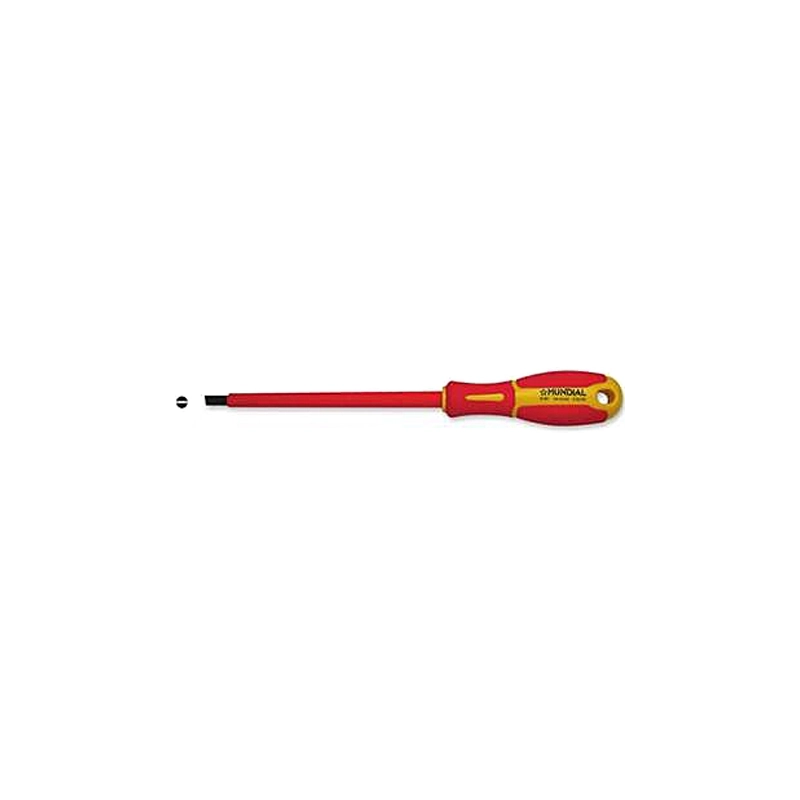 Cacciavite a taglio, isolato 1000 V certificato VDE. In acciaio cromo vanadium molibdeno. Impugnatura ergonomica bicomponente. Modello = dimensioni mm