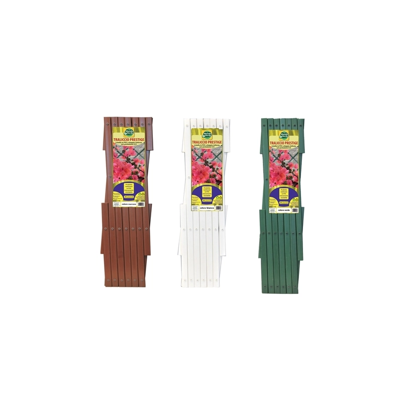 Traliccio estensibile di alta qualita' e robustezza, in PVS rinforzato e stabilizzato ai raggi UV, resistente all'intemperie e durevole nel tempo. Il listello e' costruito con un doppio rinforzo interno per aumentarne la robustezza. Sezione del listello 2,5x0,7 cm. Modello = colore/dimensioni cm