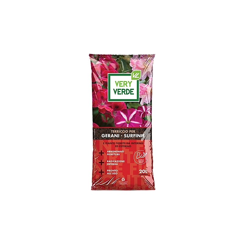 Terriccio realizzato appositamente per la coltivazione di gerani, surfinie, peonie e piante fiorite da interno e da esterno. Contenuto lt 20.