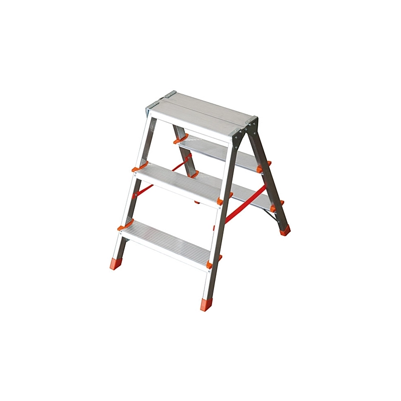 Sgabello con doppia salita in alluminio. 6 rivetti per ogni gradino. Montanti 40x20 mm. EN131 81/2008. Portata max 150 kg.