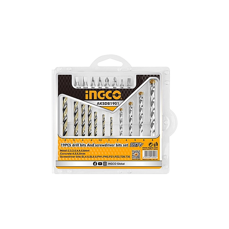 Set 19 punte per ferro, muratura e bits. 6 punte per metallo: 2, 3, 3,5, 4, 4,5, 6 mm. 4 punte per muratura: 4, 5, 6, 8 mm. 9 bits: SL4.5, SL5, SL5.5, PH1, PH2, PZ1, PZ2, T20 e T30.