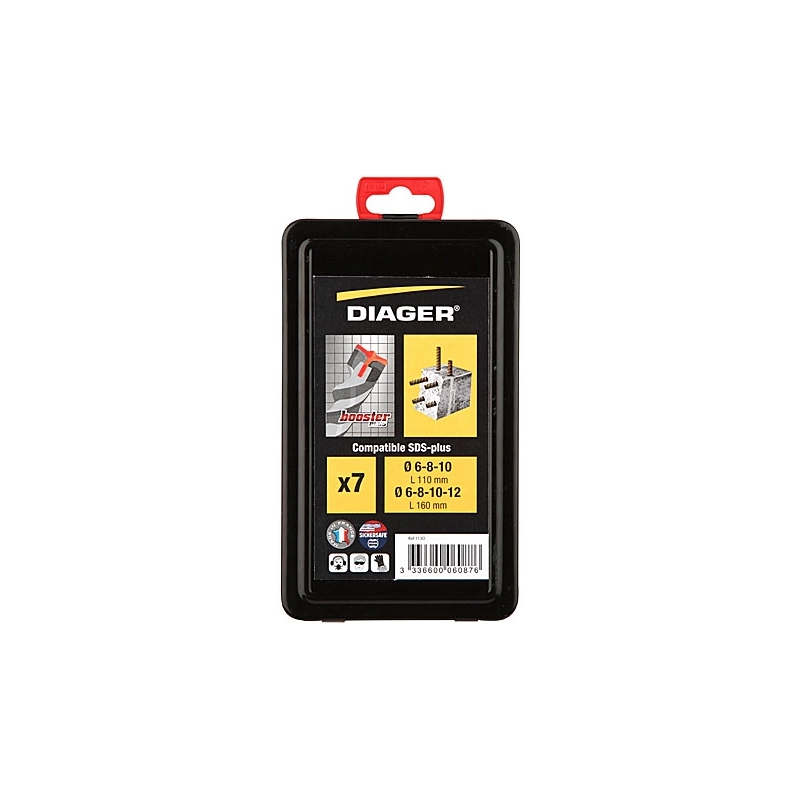 Set composto da 7 punte Booster Plus. Dotate di testa a 3 eliche con piastrina autocentrante. Forano marmo, granito, calcestruzzo vibrato, senza temere il ferro. Attacco SDS PLUS. Misure 6-8-10 mm di lunghezza 110 mm. Misure 6-8-10-12 mm di lunghezza 160 mm.
