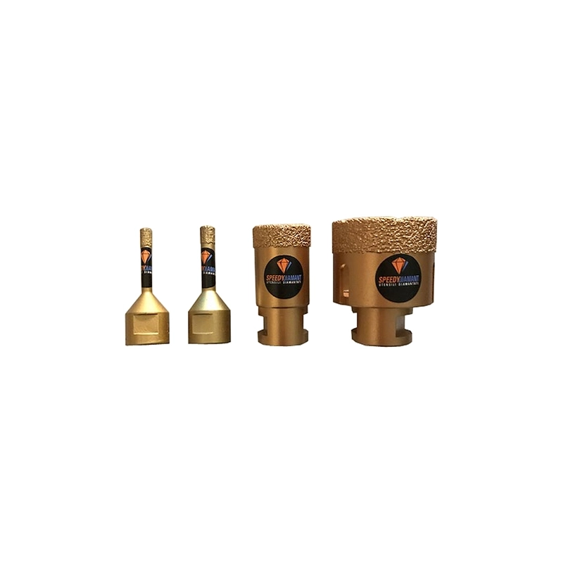 Foretti professionali per Gres e Klinker. Solo per smerigliatrici angolari. Non adatti per la foratura di cemento e pareti murali. Lunghezza 50 mm. Attacco M14. Iniziare la foratura sempre con il foretto inclinato. Disponibile espositore in plexiglass contenente 4 foretti di misure 6,8,30,50. Modello = diametro mm
