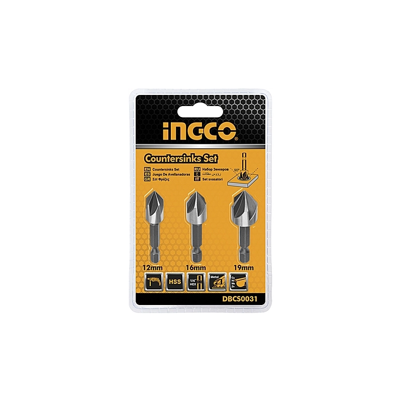 Serie 3 pezzi svasatori a 3 taglienti in HSS. Attacco 1/4' esagonale. Composta da 1 pezzo per le misure mm 12 / 16 / 19.