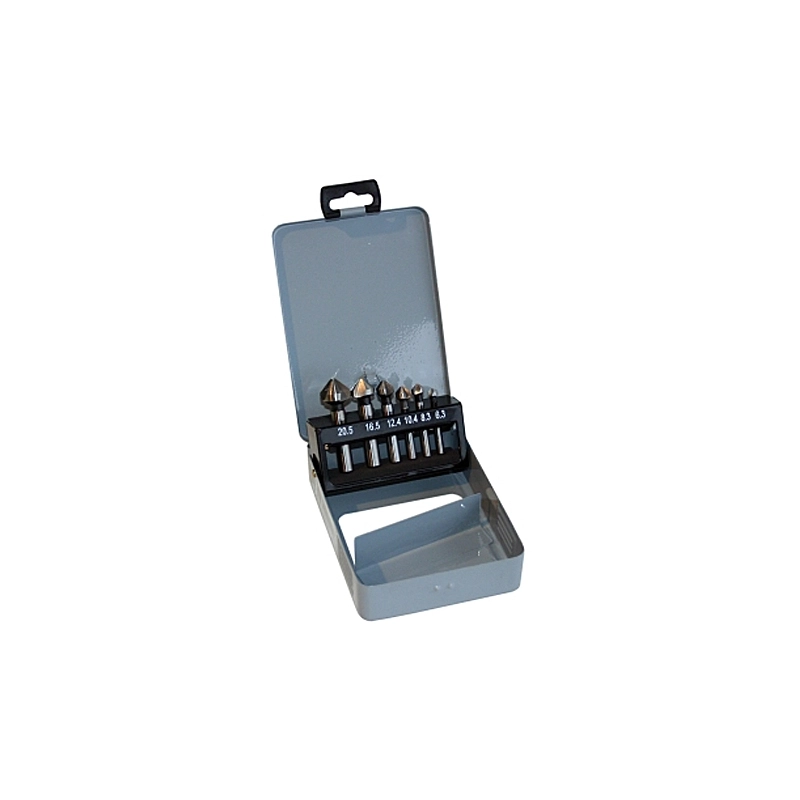 Serie 6 pezzi svasatori a 3 taglienti in HSS. Attacco cilindrico. In cassetta metallica. Composta da 1 pezzo per le misure mm 6,3 / 8,3 / 10,4 / 12,4 / 16,5 / 20,5.
