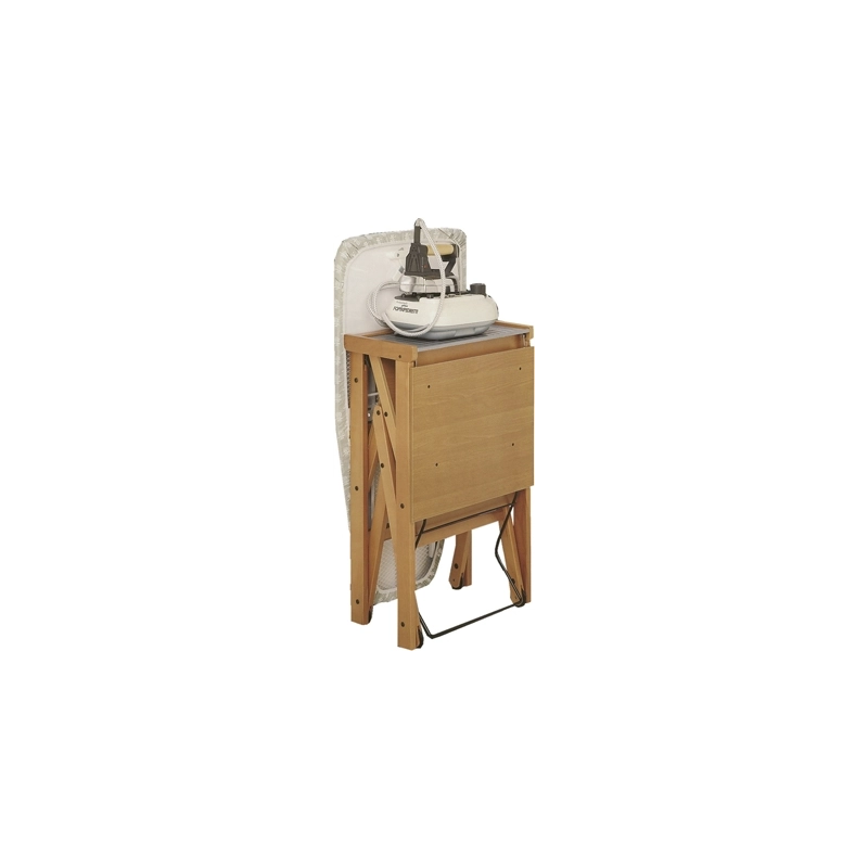 Postazione di lavoro pieghevole in legno massiccio. Molto stabile, dispone di un piano d'appoggio per ferro e per la biancheria stirata. Dimensioni aperto (lxpxh) cm 176x50x82. Colore faggio