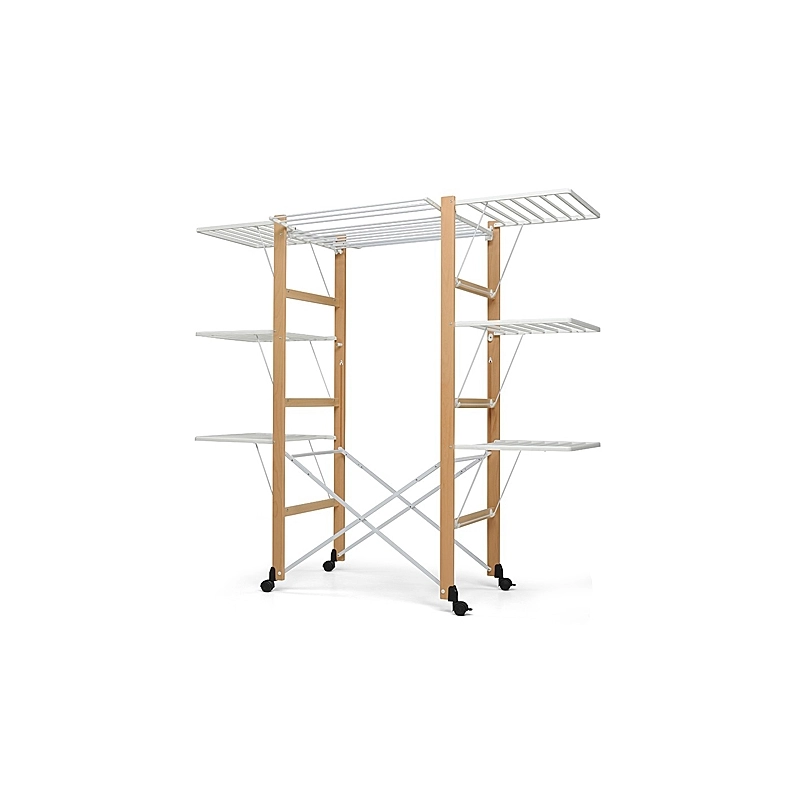 Stendibiancheria pieghevole con struttura in legno massiccio, piano centrale posizionabile al centro o in alto per stendere le lenzuola, ali laterali indipendenti, inclinabili e apribili anche solo in parte. La base e' dotata di 4 ruote. Dimensioni da aperto 80x176x164h cm. Colore naturale.