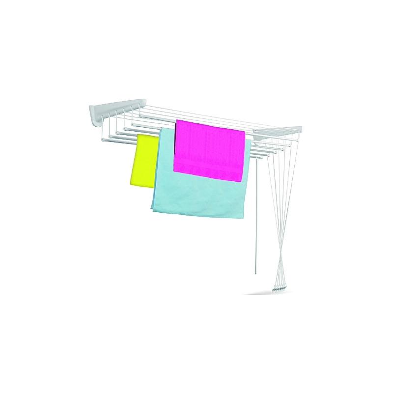 Stendibiancheria sali-scendi con tubi in acciaio ricoperto. Staffe in resina antiruggine. Possibilita' di fissaggio a parete o a soffitto. Carrucole in nylon ad alto scorrimento. Made in Italy. Modello = larghezza cm