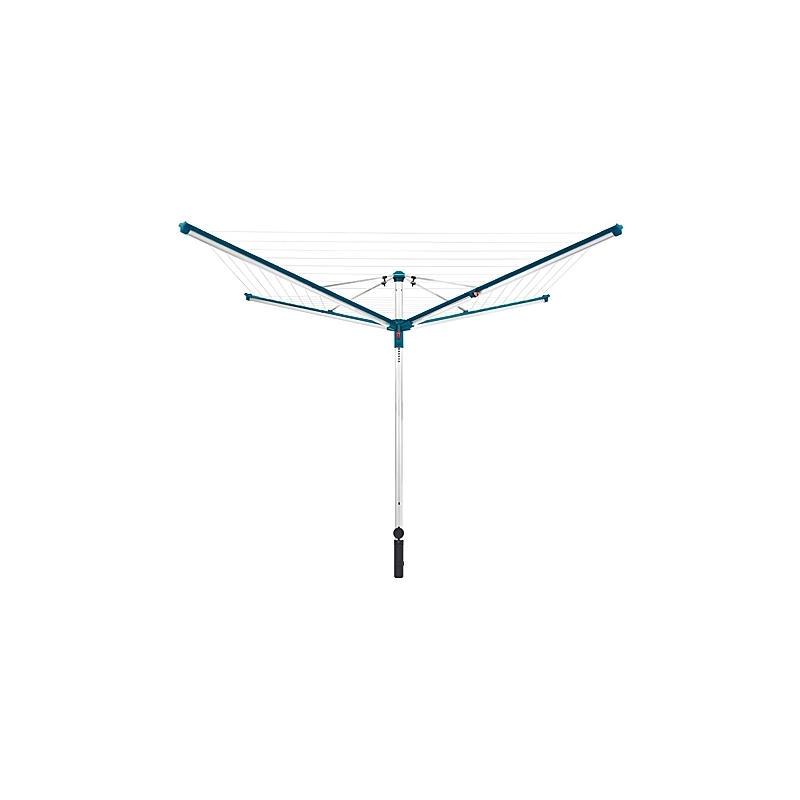 Stendibiancheria ad ombrello con ritiro automatico del filo per un bucato sempre pulito. Quando e' chiuso i fili rimangono al riparo dallo sporco nei bracci portanti. Dotato di un'impugnatura sul braccio portante per facilitarne l'apertura e la chiusura. Altezza dei fili regolabile. 8 supporti per gruccia. Completo di custodia protettiva ed inserto per il fissaggio a terra. 50 metri di filo.