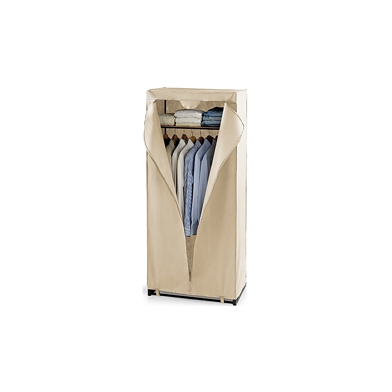 Con struttura in metallo e rivestimento in TNT traspirante. 2 ripiani d'appoggio e 1 asta appendiabiti. Chiusura a cerniera. Dimensioni cm 80x50x180h