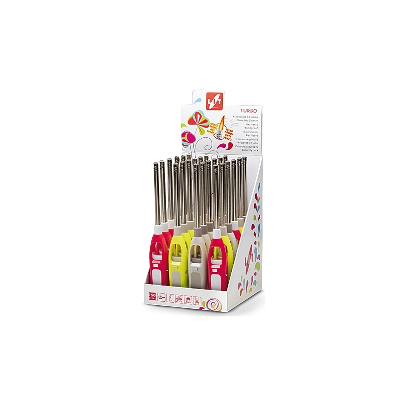 Espositore da banco da 24 pezzi di accendigas lunghi. Sistema antivento, ricaricabili e regolabili. Chiusura di sicurezza. Lunghezza totale mm 250. Colori assortiti.