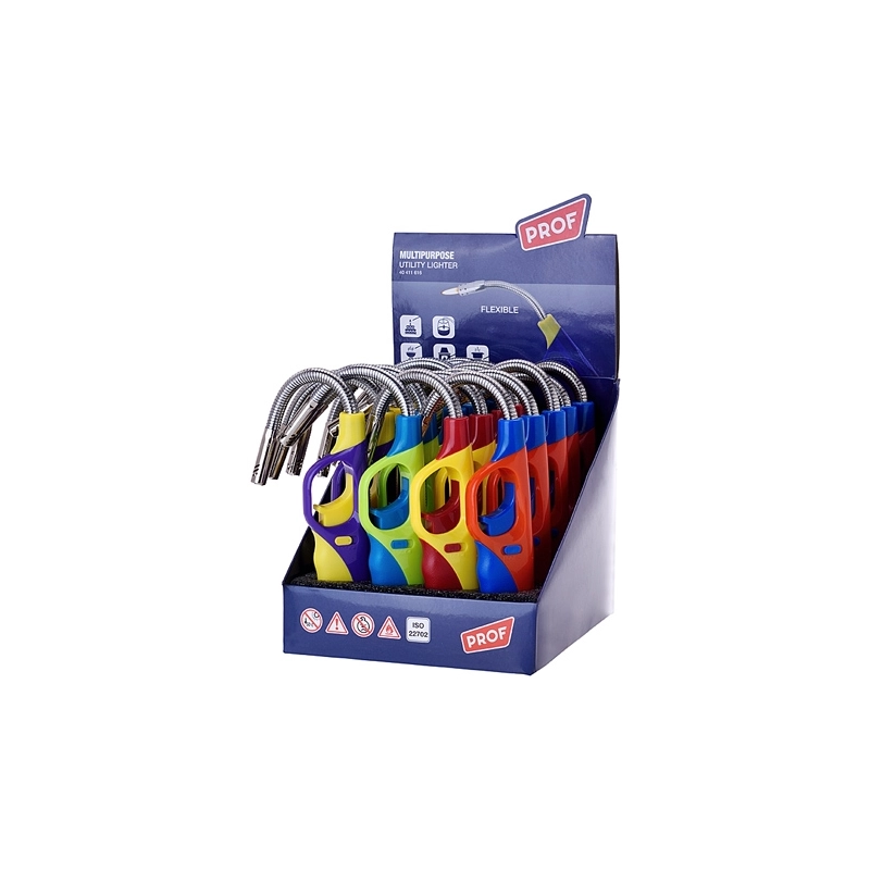 Espositore da banco da 20 pezzi di accendigas con prolunga flessibile, ricaricabili. Lunghezza totale cm 25. Colori assortiti.