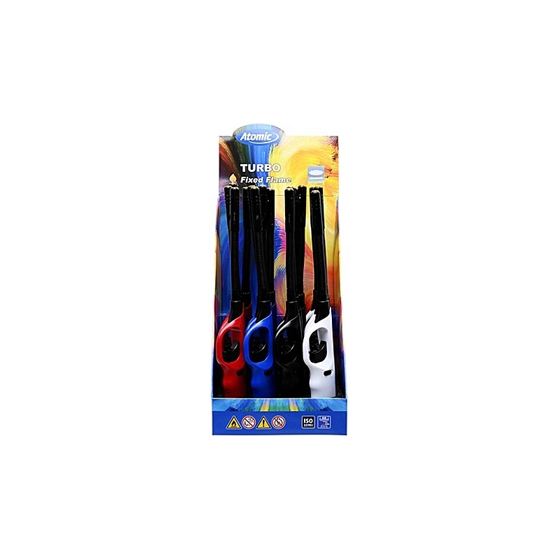 Espositore da banco da 16 pezzi di accendigas antivento con prolunga flessibile, ricaricabili. Lunghezza totale cm 27. Colori assortiti.