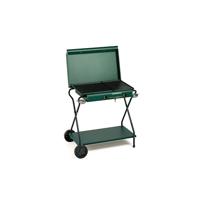 Doppia piastra di cottura 40x43 e 40x28 cm in ghisa vetrificata. Coperchio e camera di combustione in acciaio verniciato. Bruciatori in lamiera alluminata da kW 6. Gambe a cavalletto con innesto a baionetta. Ciotole raccoglisugo in acciaio inox. Dimensioni 70x40x76h cm. Peso 30,5 kg