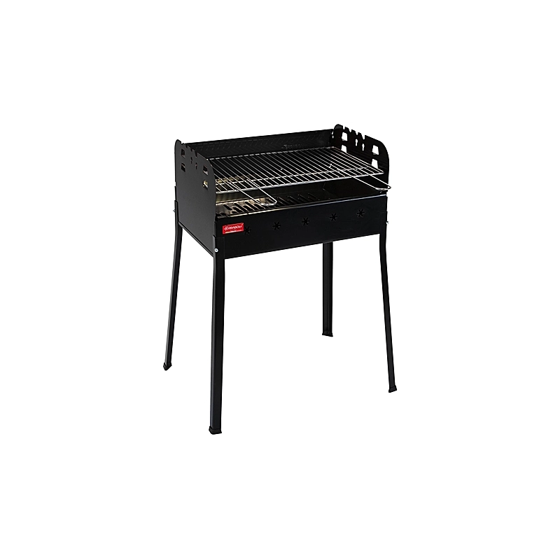 Barbecue a carbonella rettangolare con griglia cromata da cm 58x37, regolabile in altezza. Protetta sui tre lati da fianchetti paravento. Doppio braciere e fori frontali di aerazione. Dimensioni 65x48x84h cm. Peso 8 kg.