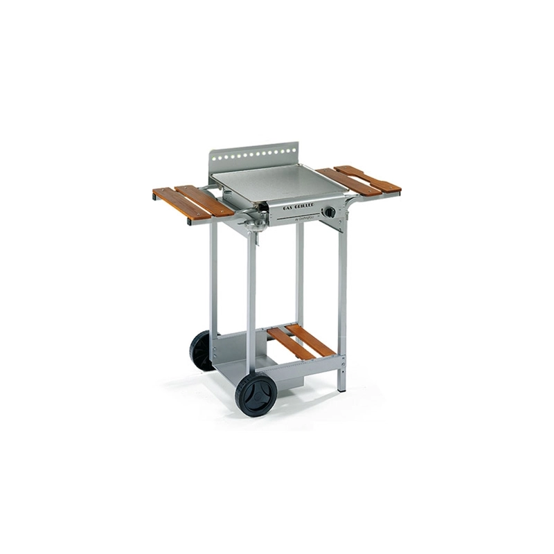 Piastra di cottura da cm 40x43 in acciaio inox. Camera di combustione in acciaio verniciato. Bruciatore in lamiera alluminata ad accensione rapida a due rampe da Kw 3,7. Carrello con portabombola in acciaio verniciato. Mensole e ripiano in legno massello. Ciotola inox raccoglisugo. Dimensioni cm 43x40x84h. Peso kg 18