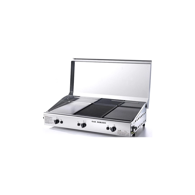 Tripla piastra di cottura cm 40x28 in acciaio inox, cm 40x28 in ghisa rigata vetrificata, e cm 40x28 in ghisa liscia smaltata. Camera combustione e coperchio in acciaio inox. N. 3 bruciatori indipendenti in lamiera alluminata ad accensione rapida ad una rampa da kW 6,9. Accensione piezoelettrica. Cappa paravento e cassetti raccogli sugo. Dimensioni cm 40x82x21,5h. Peso kg 30,58. GPL.