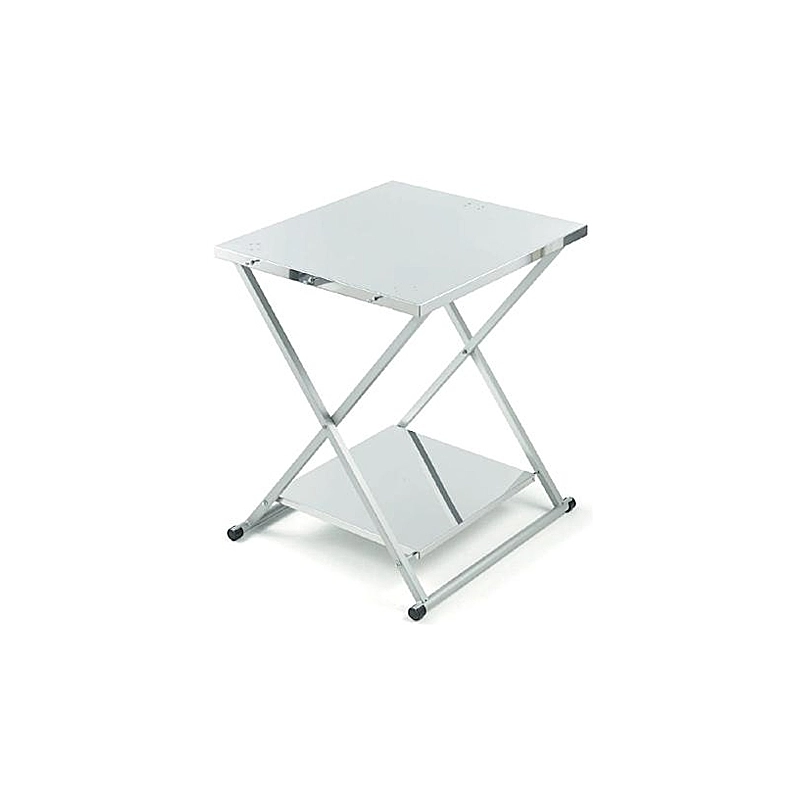Tavolo pieghevole. Piano superficie in acciaio inox spessore 1,2 mm, completo di porta utensili e staffa blocca forno. Ripiano inferiore in acciaio inox. Telaio verniciato a polvere resistente alle interperie. Dimensioni 70x78x90h cm. Peso 19,5 kg.