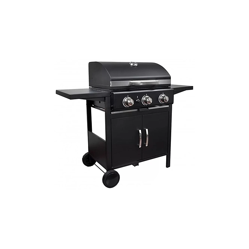 Barbecue a 3 fuochi con piani di appoggio laterali. Maniglia in acciaio inox. Portine anteriori. Con ruote per agevolare lo spostamento. Vano porta bombola. Accensione piezo, 9 kw (3 kw per ogni bruciatore). Con termometro e griglia scaldavivande. Dimensioni 127x58x103cm.