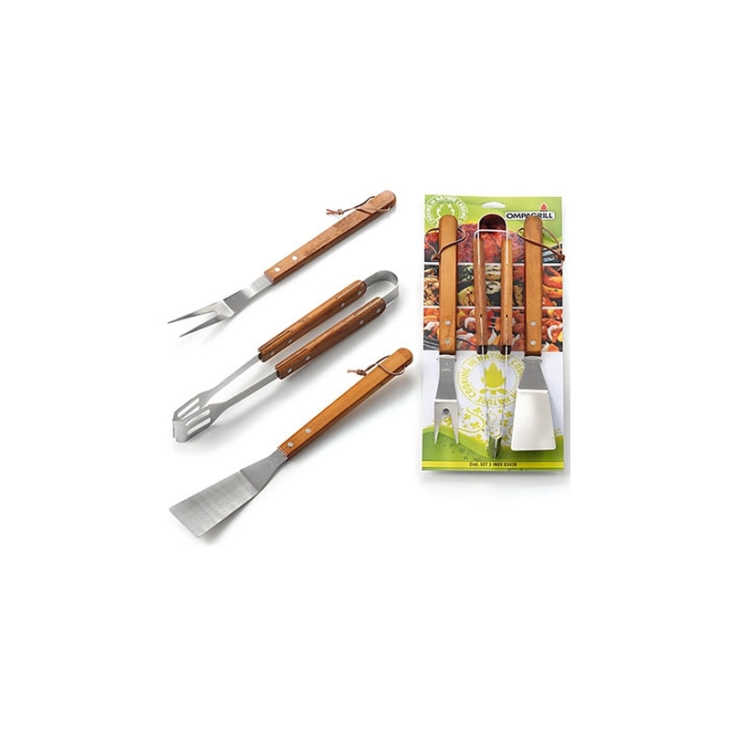Pinza, forchettone e paletta in acciaio inox con manico in legno. Lunghezza 40 cm
